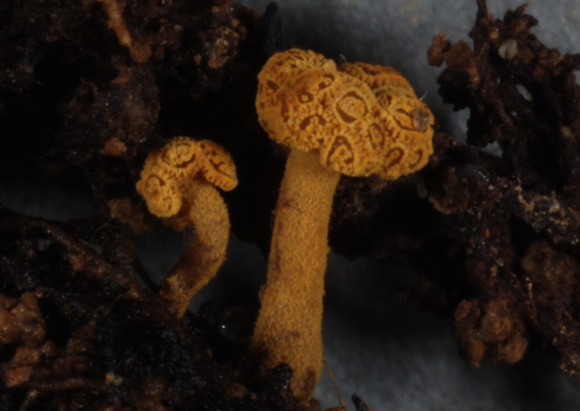 This fungus is thought to be a mycorrhizal, its hyphae growing through the soil to interact with the roots of beech trees. It is a cup fungus, a discomycete. This fungus has no genus or species name as yet, but its cups are at the tips of four branches that form from the top of a central stalk. Perhaps ‘Brahma’ will form part of its name, referencing the four-headed Hindu creator god.